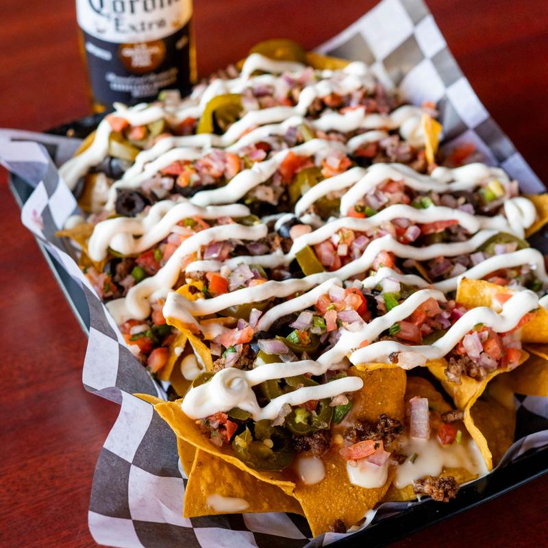 Warm tortilla chips piled with your choice of savory seasoned beef or juicy sliced grilled chicken. Smothered in creamy queso, topped with fresh pico de gallo, jalapenos, black olives, and a drizzle of sour cream.