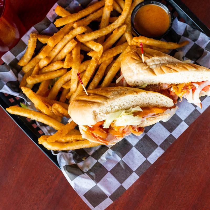 Tender slices of turkey, ham, crisp bacon, fresh lettuce, tomato, onion, cheddar cheese and creamy mayo. Served on a toasted hoagie with house made honey dijon for dipping.