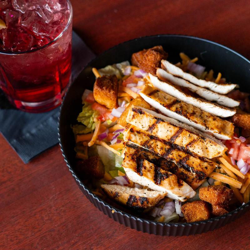 Tender, sliced grilled chicken atop a crisp mix of greens, black olives, tomatoes, and crumbled feta cheese. Tossed in our house made balsamic vinaigrette with crunchy tortilla strips.