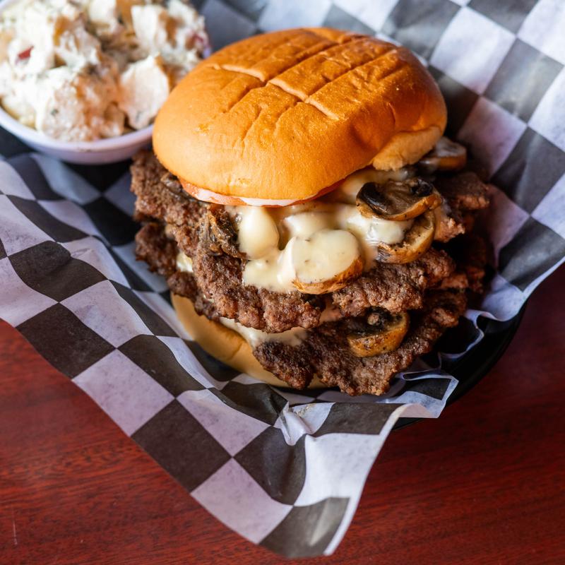 Sauteed mushrooms and melted Swiss cheese. Piled onto a toasted bun with fresh tomato and garlic aioli spread.