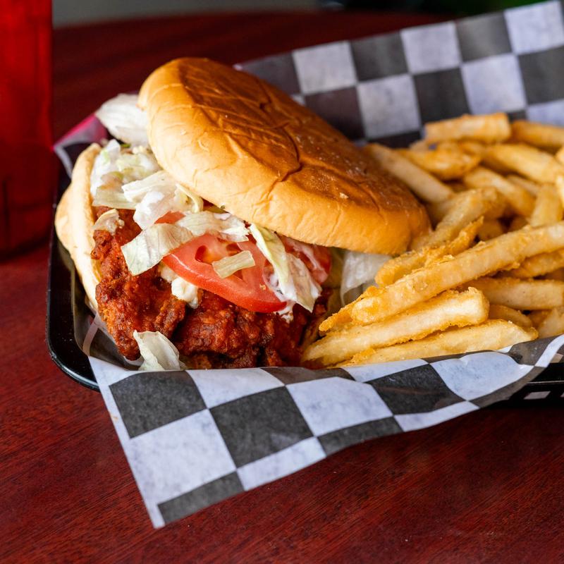 Crispy, hand battered chicken breast tossed in tangy buffalo sauce and topped with lettuce, tomato, pickle, crumbled bleu cheese and ranch dressing. Served on a toasted bun.