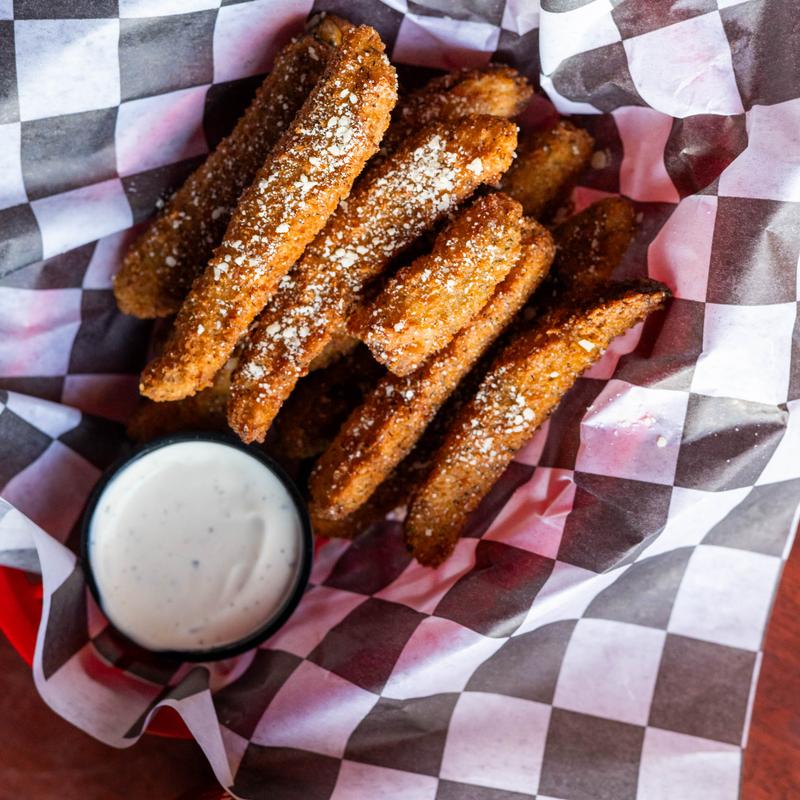 Tangy BBQ sauce, crispy bacon, and pickles. Topped with a fried onion ring and served on a toasted bun with mayo and cheddar cheese.